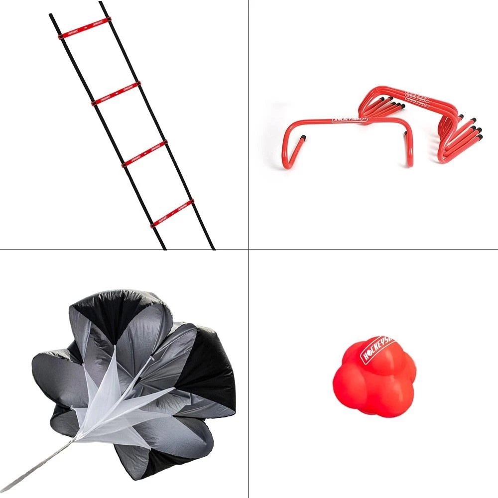 - Contains 1x Reaction Ball, 1x Agility Ladder, 1x Resistance Chute, and 4x Hurdles.