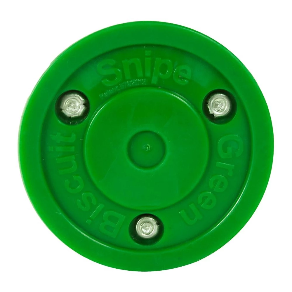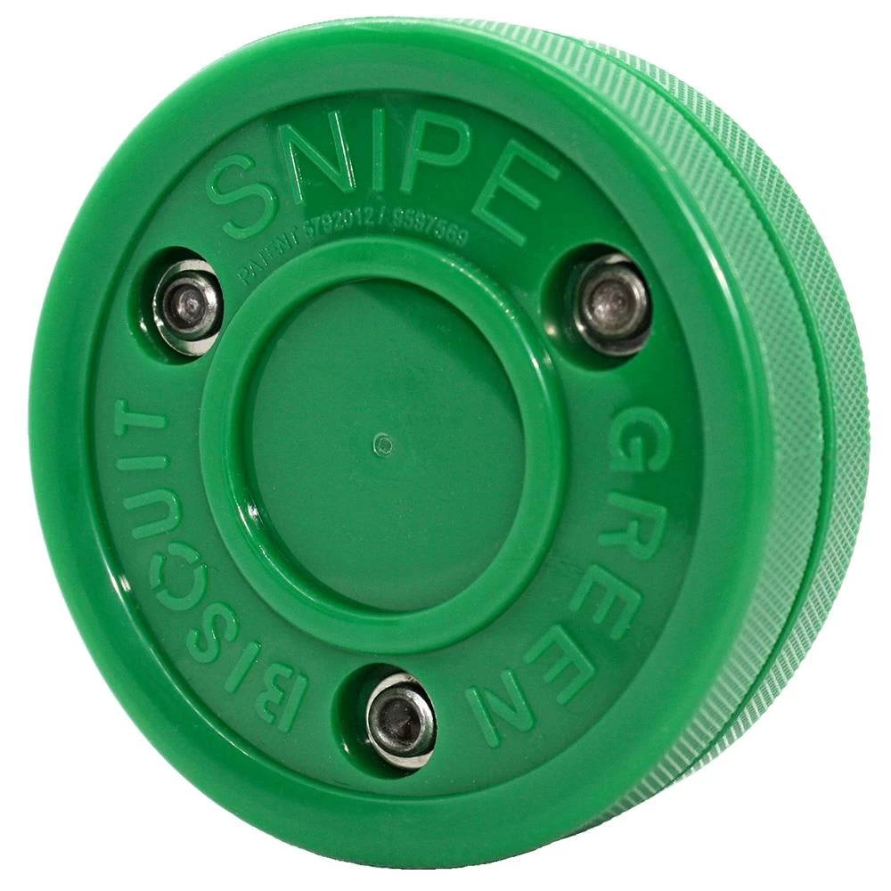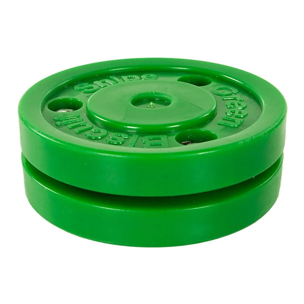 The Green Biscuit Sniper puck is an off-ice training hockey puck that will help you and your team develop passing, stickhandling, and shooting skills. The Biscuit weighs about an ounce less than a hockey puck but with the added friction from the concrete or asphalt it acts just like the real thing on ice.