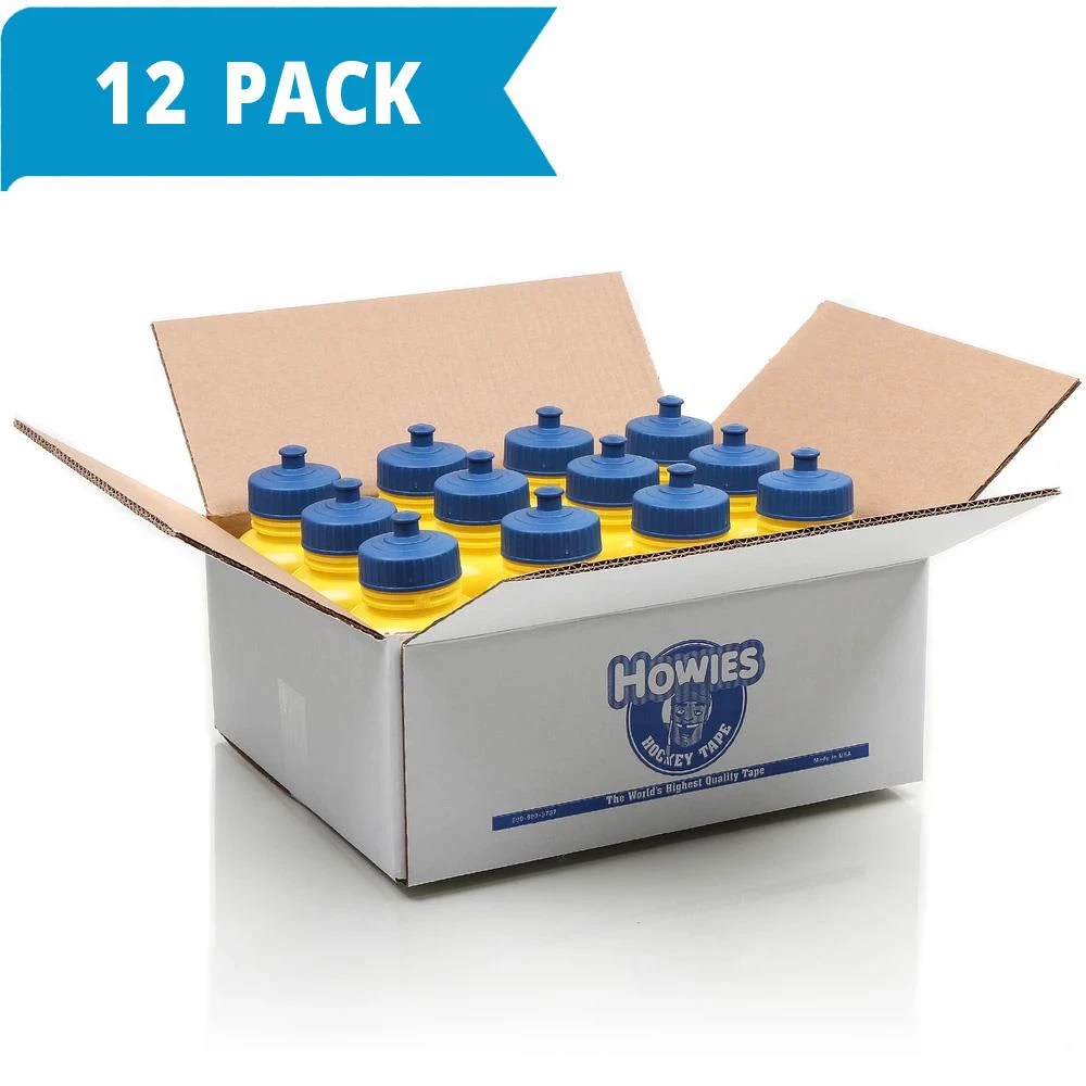 Every now and again you snipe one top cheese and the tendys beverage goes spilling everywhere Nice shot! Howies bright yellow water bottles offer a built-in bullseye to aim for. Our hockey water bottles are 100% BPA Free. They are made from a soft squeezable plastic and a durable rubber top that stands up to the abuse theyll certainly take on the bench.